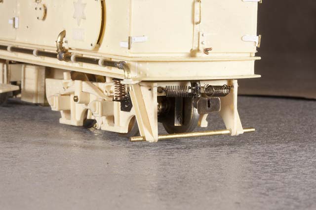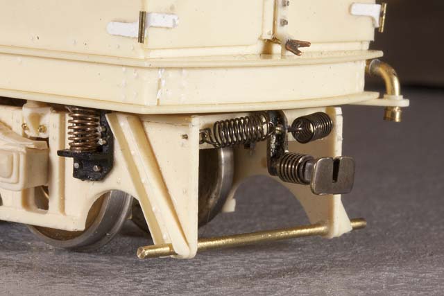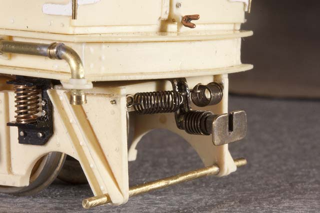 Claude Buzer a conçu son modèle pour utiliser des attelages Kadee, certes très fonctionnels, mais dont l'aspect n'a aucun rapport avec celui des attelages équipant les locotracteurs réels. J'ai donc préféré concevoir de nouveaux attelages en me basant, en l'absence de plan, sur les photos dont je disposais.