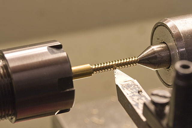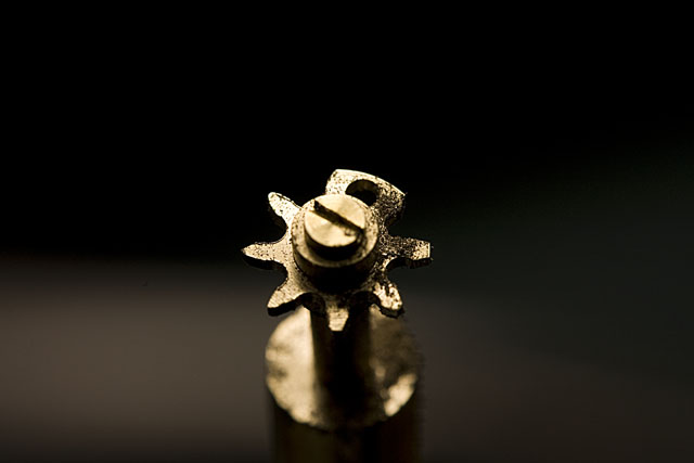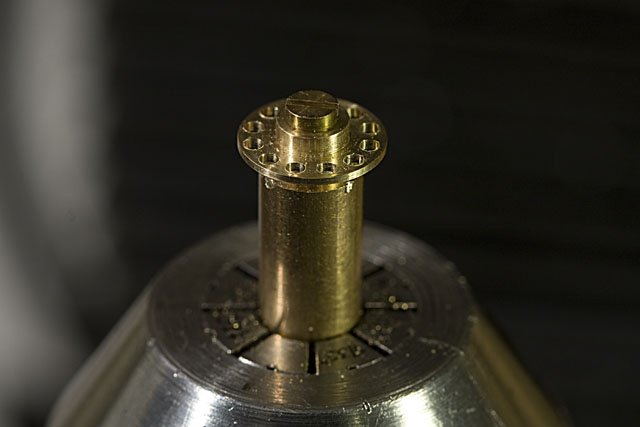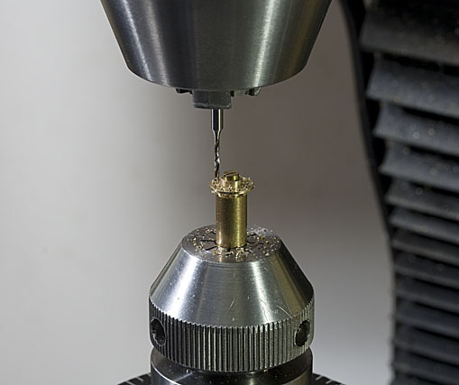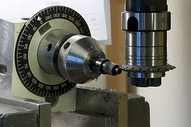 Les roues dentées de la transmission par chaine sont d'abord ébauchées dans un jet de laiton, puis les emplacements des rouleaux sont percés sur le diviseur.
