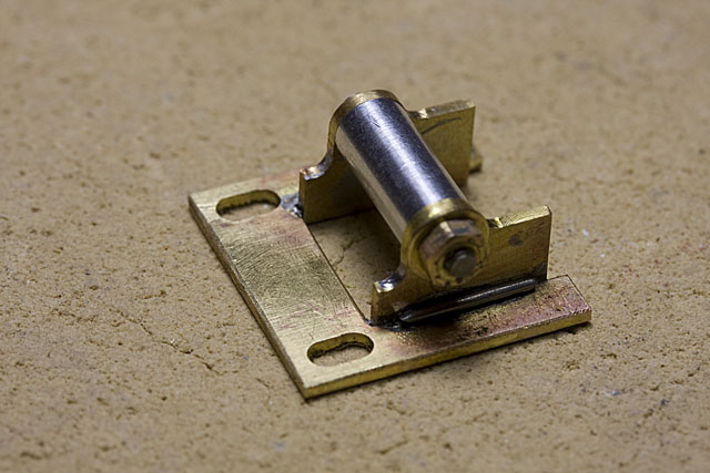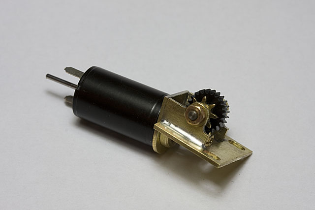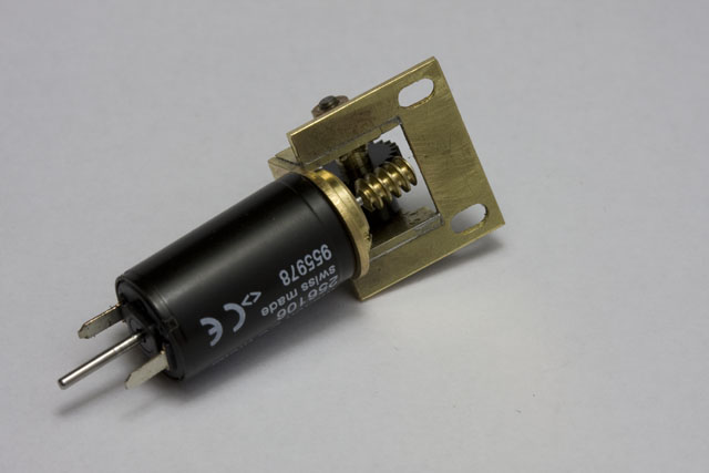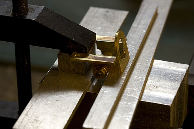Le support du moteur et du premier de réduction est réalisé en laiton. Pour plus de solidité, les pièces sont soudées entre elles avec de la soudure à 4% d'argent. L'utilisation de gabarits en aluminium permet de garantir après soudure une géométrie conforme à celle prévue.